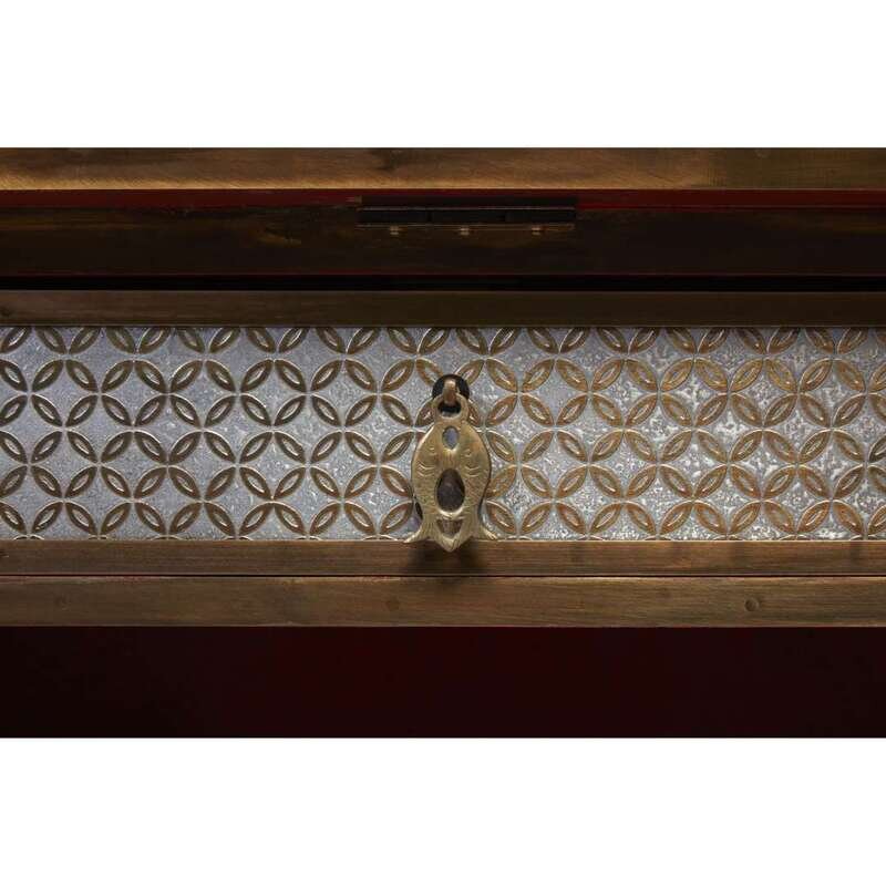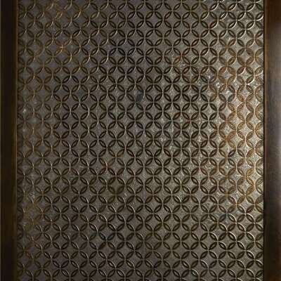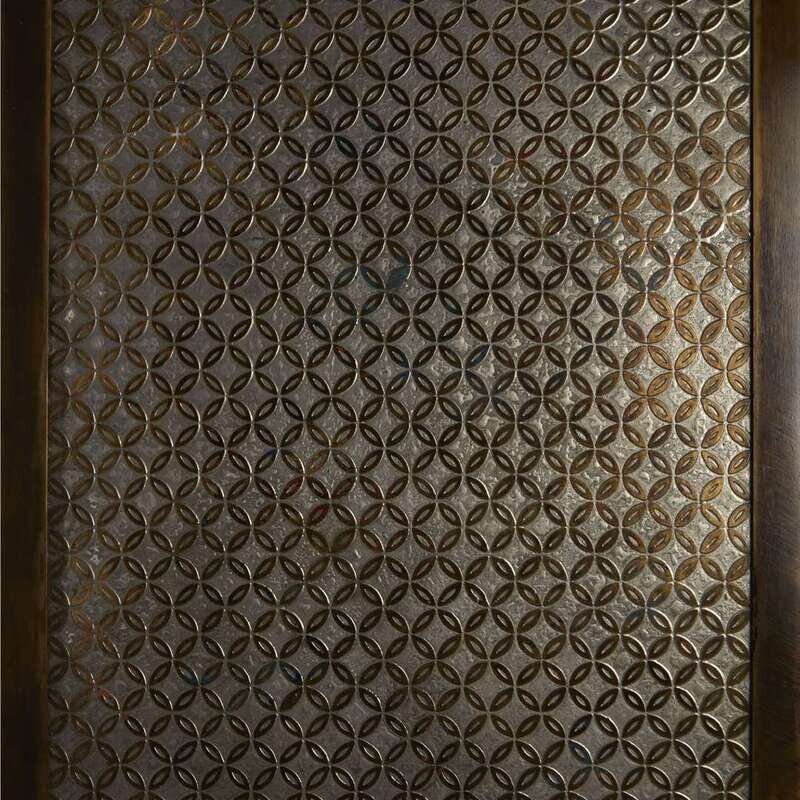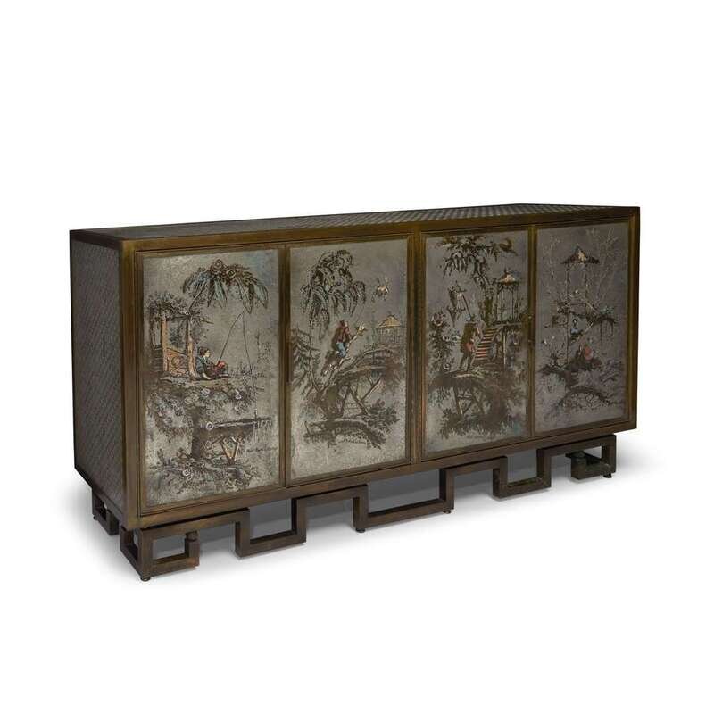 Etched and patinated bronze, pewter, painted wood The doors with Chinoiserie landscape, each with raised signature: "Philip Kelvin LaVerne", the case top and sides with "Interlocking Circles" motif.