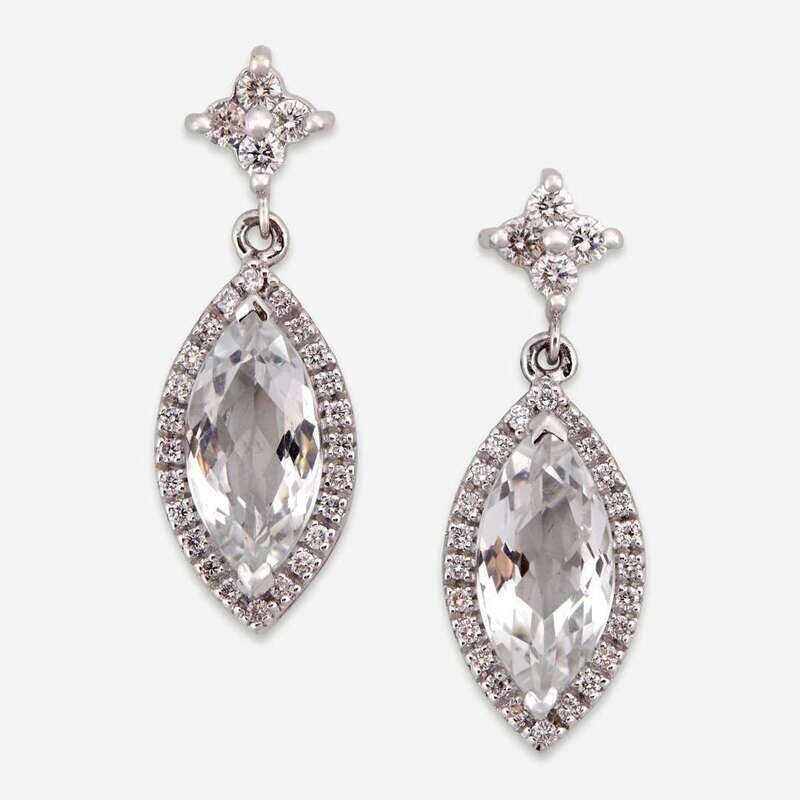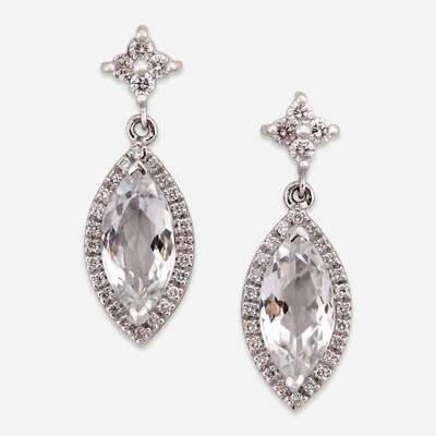 A pair of white topaz, diamond, and eighteen karat white gold drop earrings