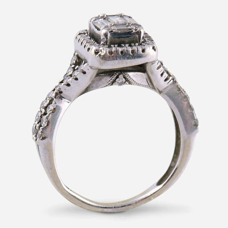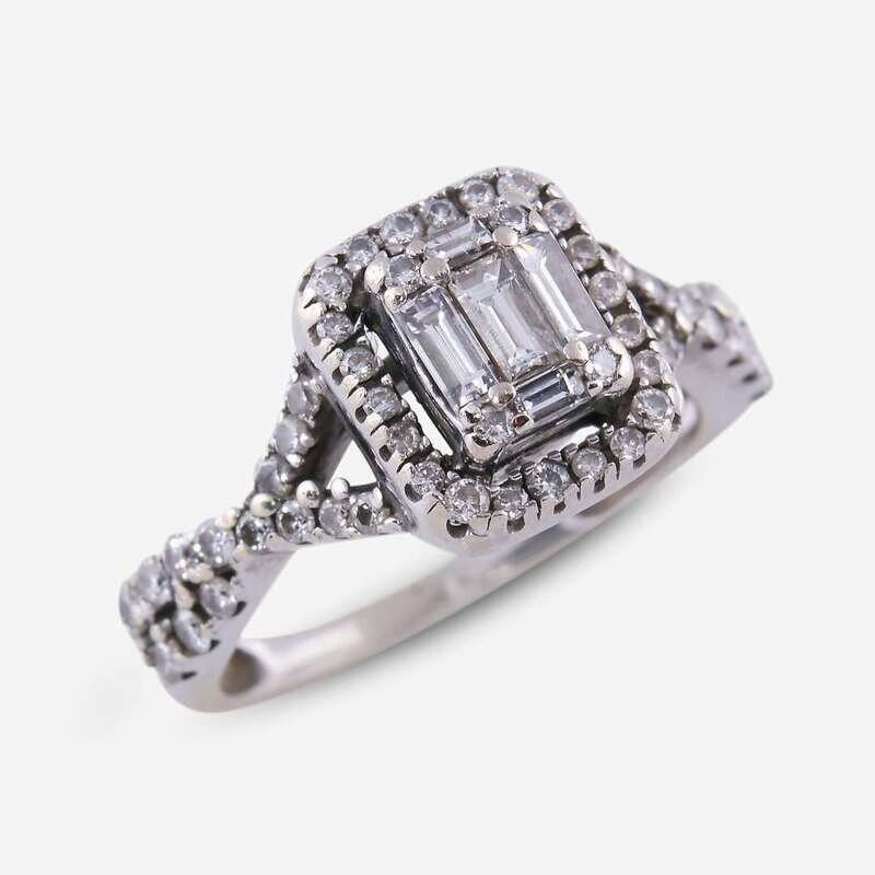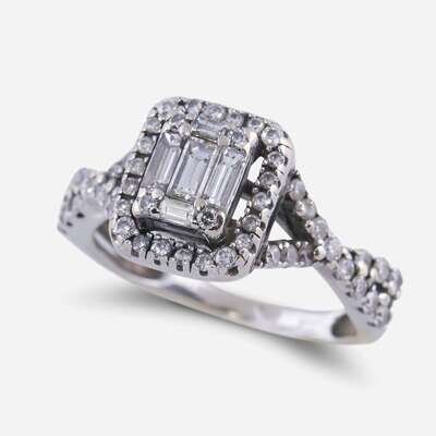 designed as a baguette and round brilliant-cut diamond cluster, within a round brilliant-cut diamond halo; estimated total diamond weight: 0.50 carat.