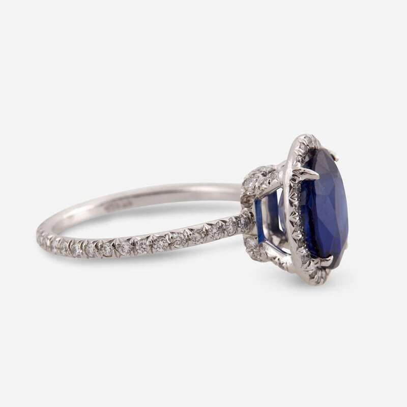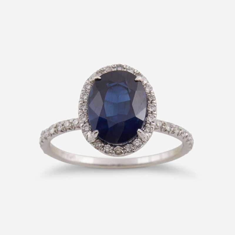 designed as an oval mixed-cut sapphire weighing 3.14 carats framed by round brilliant-cut diamonds on diamond hoop.