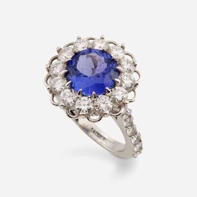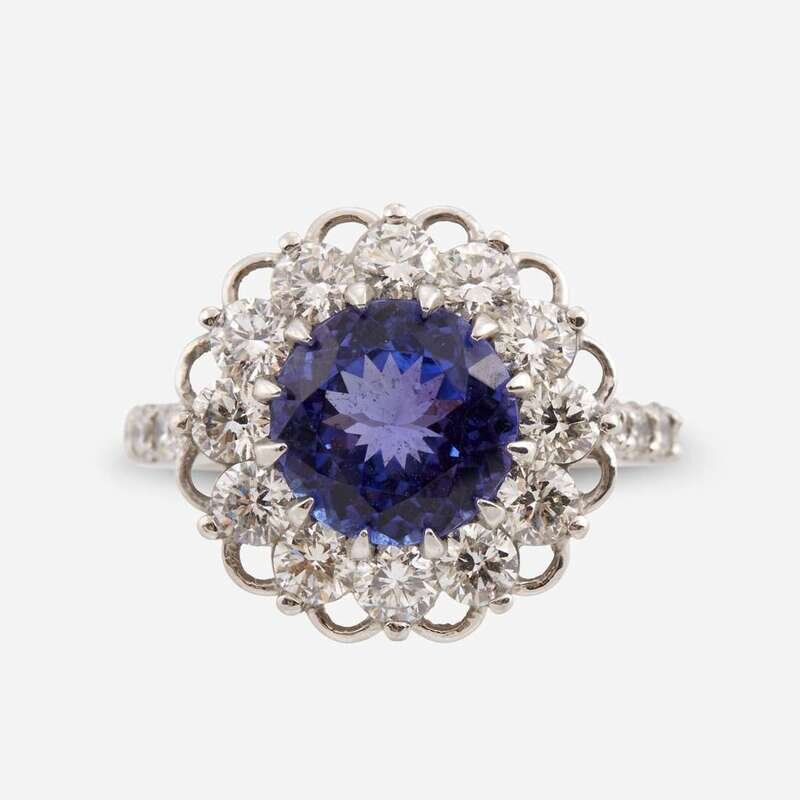 designed as a circular-cut tanzanite measuring approximately 9.50mm x 5.40mm, framed by round brilliant-cut diamonds and scalloped platinum wire; estimated total diamond weight: 2.20 carats.