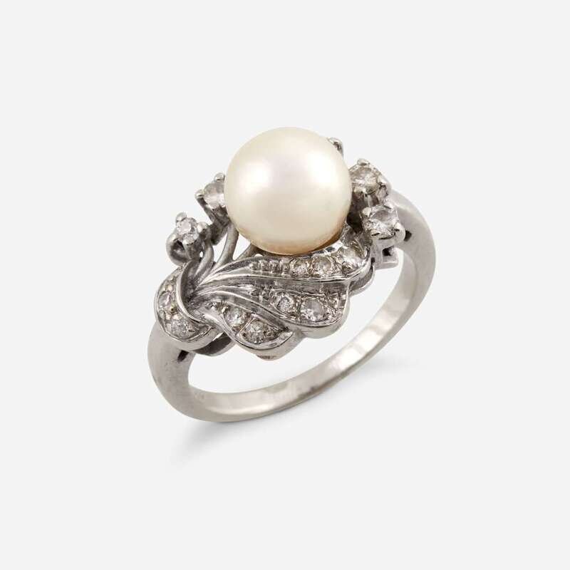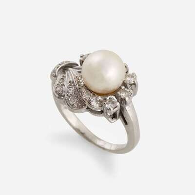 A cultured pearl, diamond, and fourteen karat white gold ring