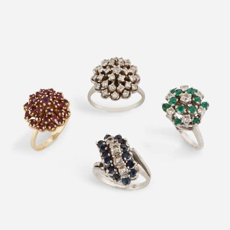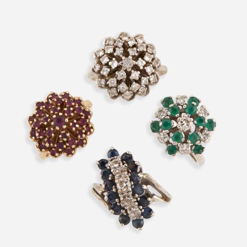including a round brilliant-cut diamond and sapphire fourteen karat white gold waterfall ring; two diamond and fourteen karat white gold cluster rings, one with circular-cut emeralds; and a circular-cut ruby and ten karat yellow cluster ring; estimated total diamond weight throughout: 2.15 carats.