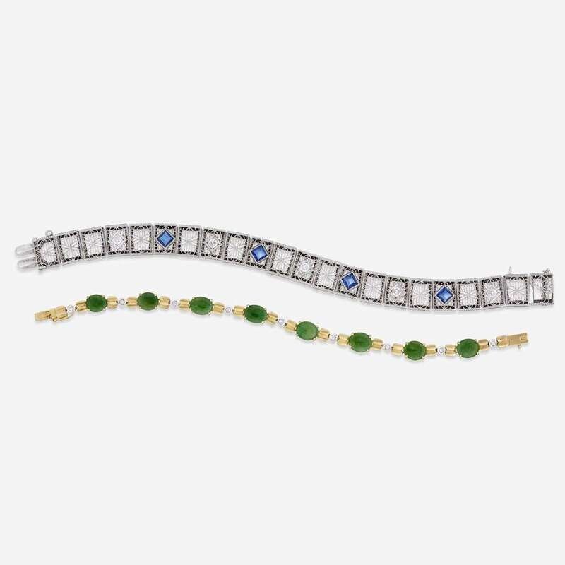 one set with sugarloaf sapphires and round brilliant-cut diamonds mounted in platinum topped fourteen karat gold; the other set with dyed jadeite and round brilliant-cut diamonds mounted in eighteen karat gold.