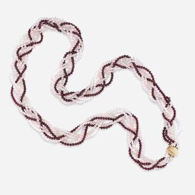 designed as six-strands of carved beads measuring approximately 4.30 mm, joined by a fourteen karat gold clasp.