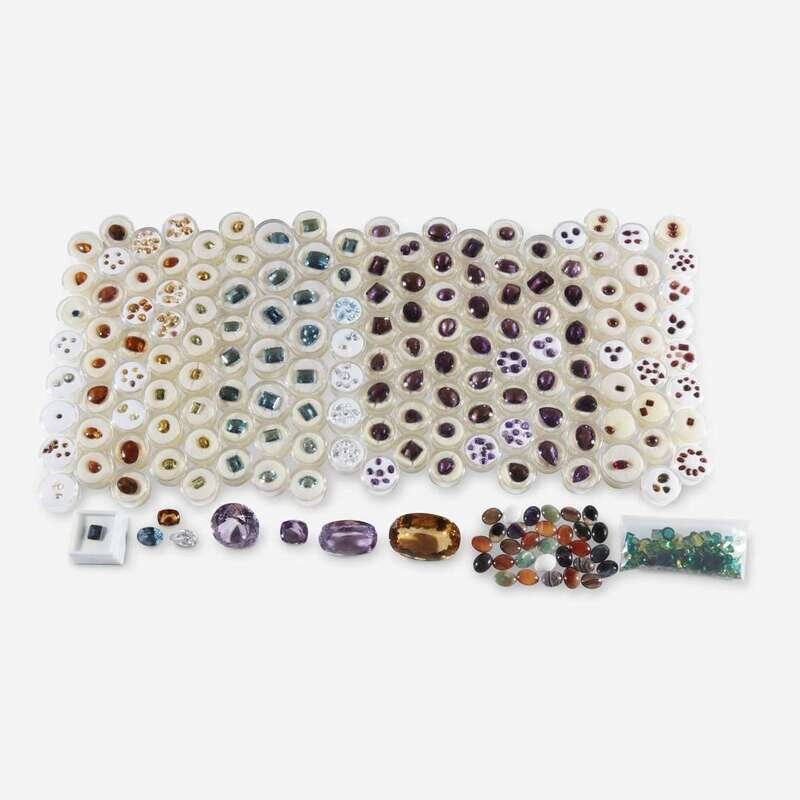 including approximately 191.80 carats of citrines, each weighing approximately 0.25 to 24.50 carats; approximately 423.50 carats of blue topaz, each weighing approximately 0.45 to 36.50 carats; approximately 32.75 carats of white topaz, each weighing approximately 0.15 to 1.60 carats; approximately 878.20 carats of amethysts, each weighing approximately 0.25 to 34.50 carats;. approximately 90.50 carats of garnets, each approximately 0.35 to 7.75 carats; approximately 22.00 carats of yellow beryl, each approximately 3.00 to 4.25 carats; approximately 23.00 carats of green beryl, each approximately 1.75 to 4.00 carats; an oval-cut smoky quartz weighing approximately 366.00 carats; approximately 52.60 carats of lavendar quartz, each approximately 53.00 - 237.00 carats; approximately 303.60 carats of hardstone cabochons; approximately 278.90 carats of other gemstones.