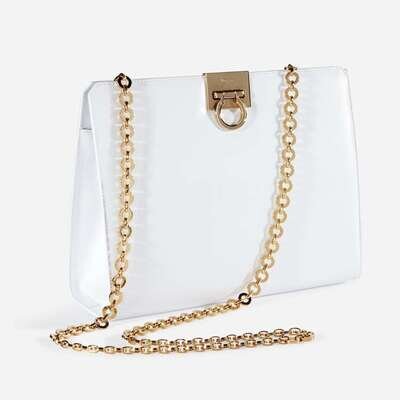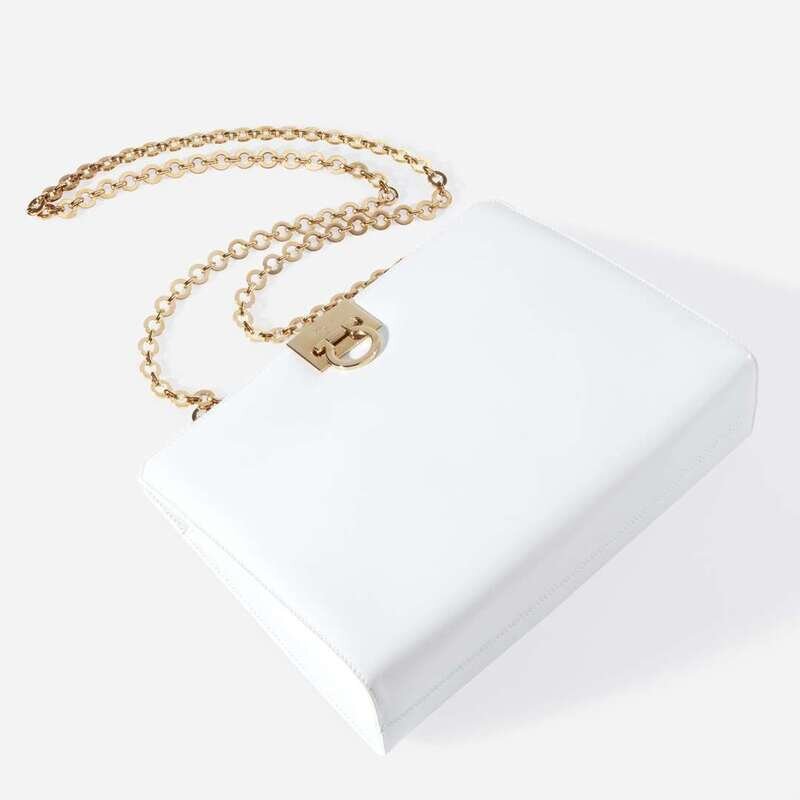 the white leather bag with gold-plated hardwear and fabric interior.