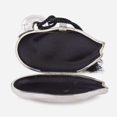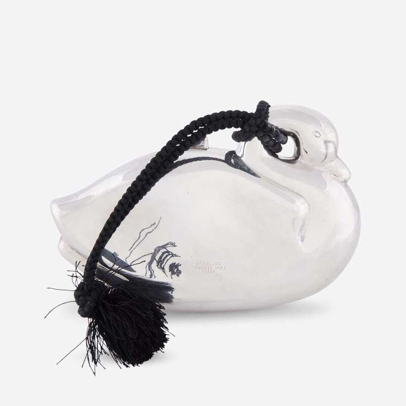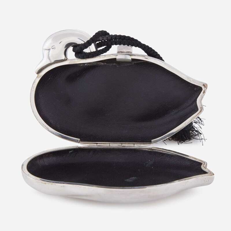 designed as a swan with braided silk tassel and leather interior.