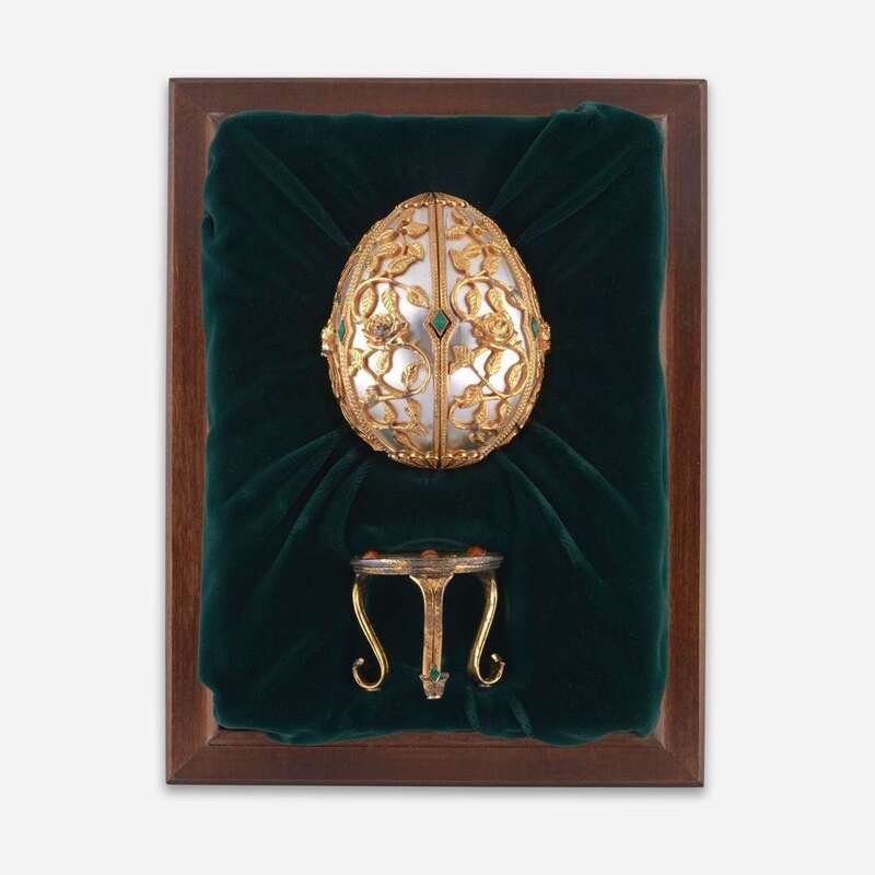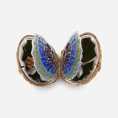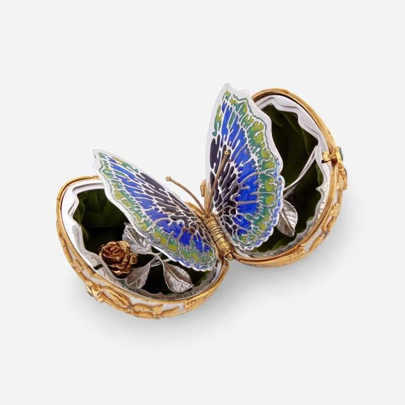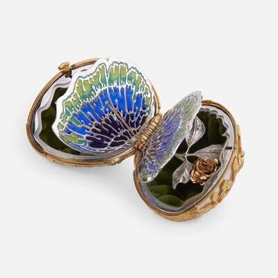 Issued by the Franklin Mint, circa 1977, numbered 335/750, gold-plated sterling silver, set with diamond-shaped malachite gemstones, opening to reveal an enameled sterling silver butterfly and long stem rose resting on green velvet, seated on a gold tripod stand set with diamond-shaped malachite gemstones, presented in velvet-lined, fitted wooden box.