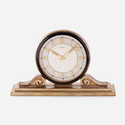 designed as a two-tone dial with applied Arabic hours, mechanical movement, upon a scrolling brass base.