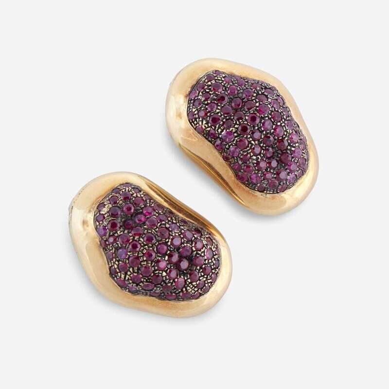 an organic form with circular-cut ruby pavé over patinated ground and polished gold trim; estimated total ruby weight: 7.00 carats.