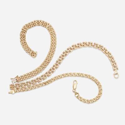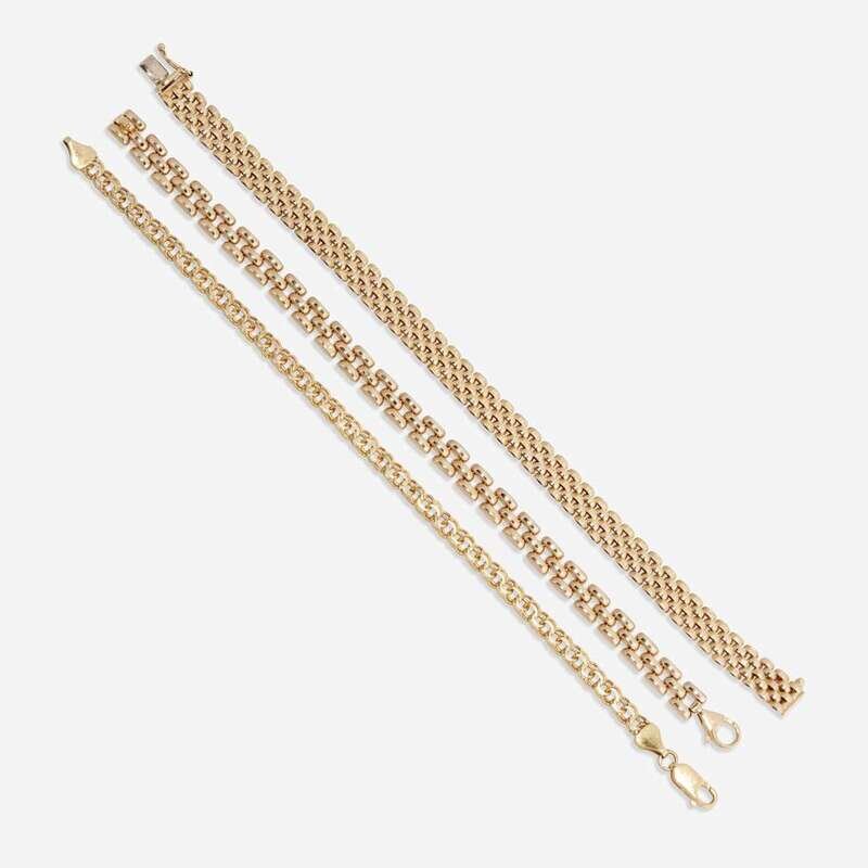 including a fourteen karat gold brick link strap; a ten karat modified brick link strap; and an eighteen karat double curb link chain.