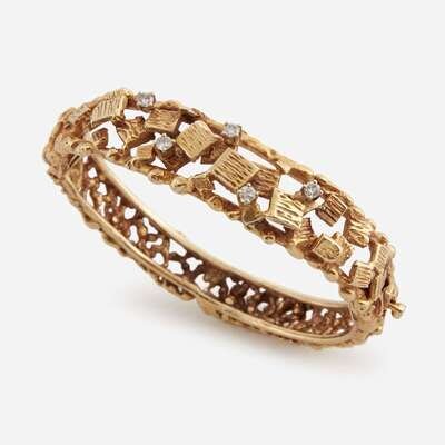 A Modernist fourteen karat gold and diamond bangle bracelet