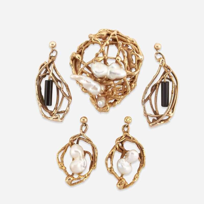 including a brooch and drop earring suite set with baroque pearls; and a pair of drop earrings set with onyx.