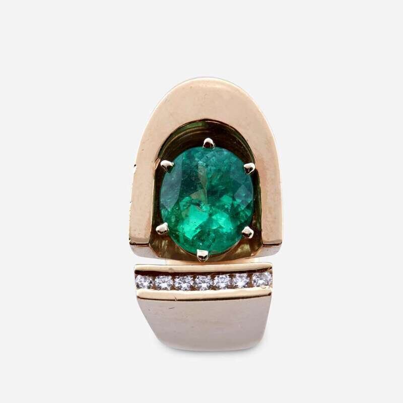designed as an oval-cut emerald measuring approximately 10.00mm x 8.40mm x 6.50mm, accented by round brilliant-cut diamonds, within substanial geometric mount.