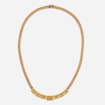 designed as articulated brushed eighteen karat gold links trimmed in polished gold, accented by round brilliant-cut diamonds on unassociated fourteen karat Italian curblink chain.
