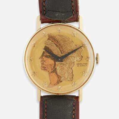 designed as a "Liberty Coin" dial with star-shaped hours, twenty-two jeweled movement, on leather strap.