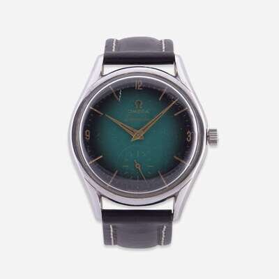 the green and black dial with applied gold Arabic and dash hours, sub-dial, in stainless steel case, on unoriginal leather strap.