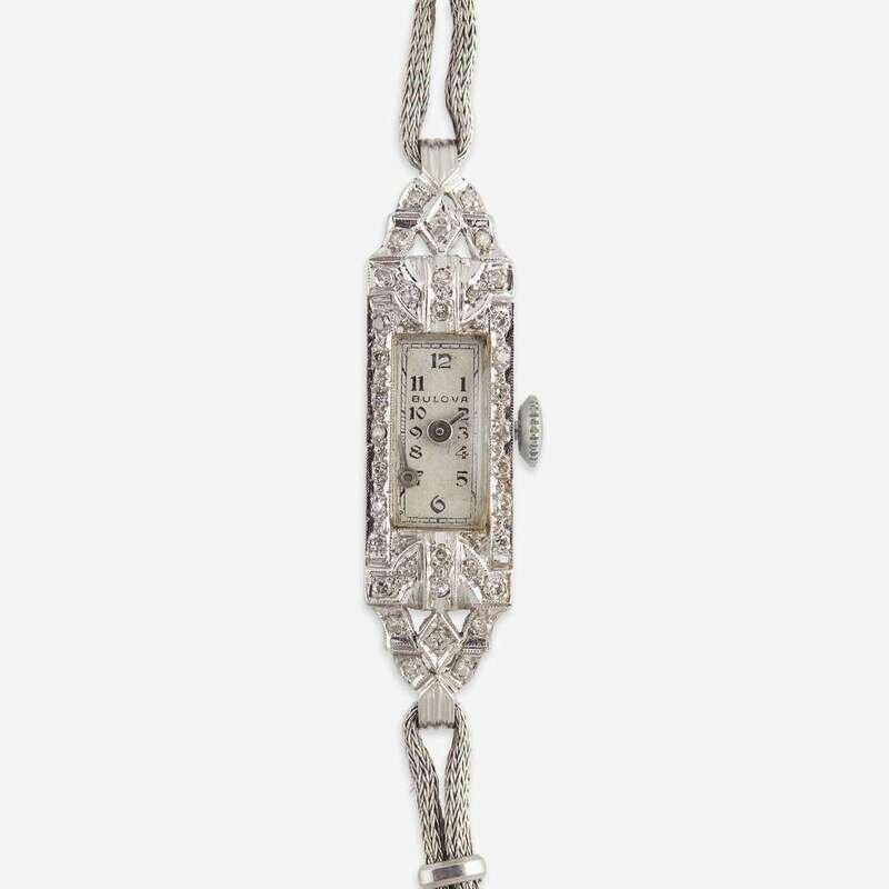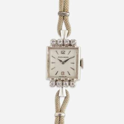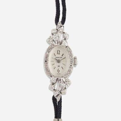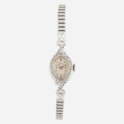 A collection of four fourteen karat white gold, platinum, and diamond wristwatches, Movado, Bulova, and two Hamiltons circa 1910's to 1930's