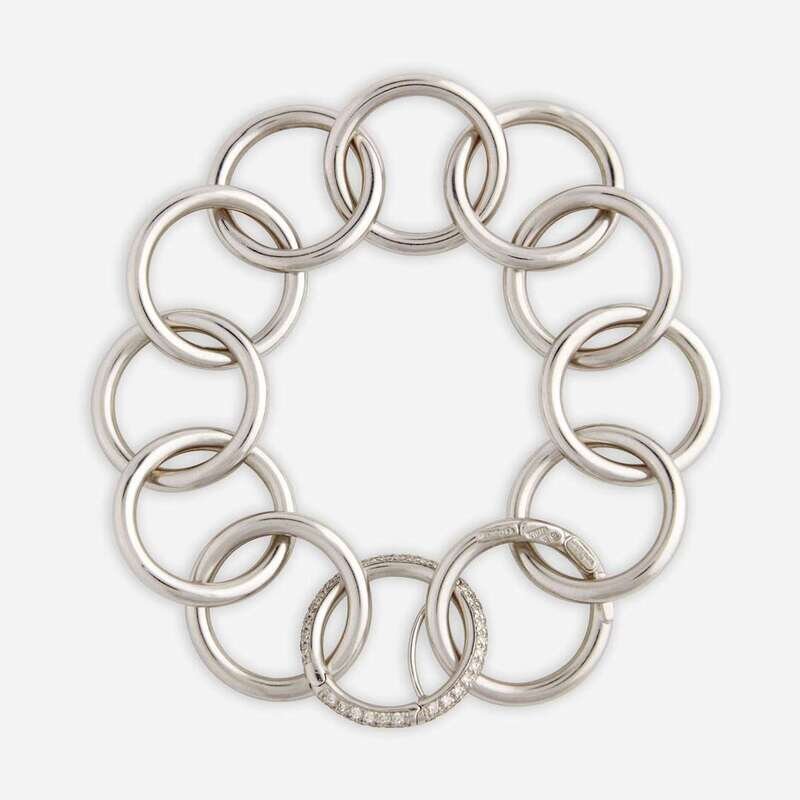 designed as polished circular links, joined by an integrated pavé-set round brilliant-cut diamond clasp; estimated total diamond weight: 1.00 carats.