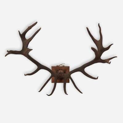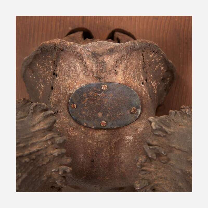 Mounted on a square wood plaque for hanging, with silverplated label inscribed "Fossil Horns found on the Estate of Almond AD 1822".
