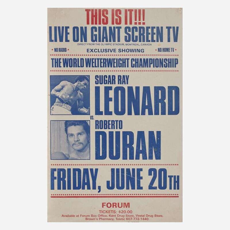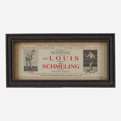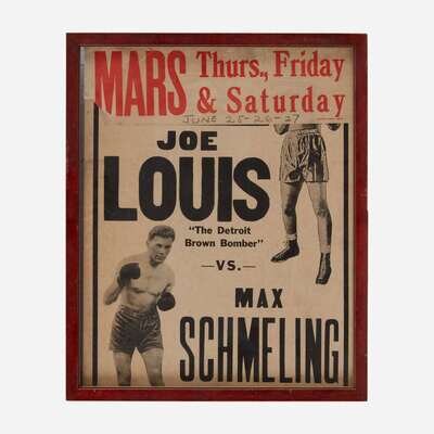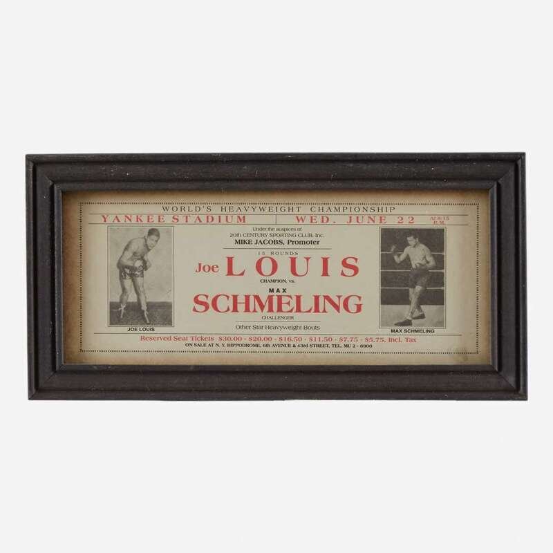 Comprising a Joe Louis vs. Max Schmeling fight poster, framed; an original Joe Louis vs. Max Schmeling fight card, framed; and a Sugar Ray Leonard vs. Roberto Durand Championship fight poster, unframed.