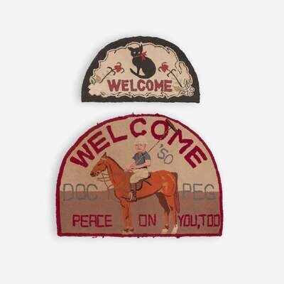 The first, depicting veterinarian Dr. John "Doc" Masterton of the Kingston Polo Club, Kingston, Jamaica with inscription, "Welcome Doc Peg, Peace on you two", with maker's note on verso binding, "Made for his good friend Doc, Peg Hemut (sic) begun Feb. 1950 & finished 1951.....," together with a welcome mat depicting a cat.