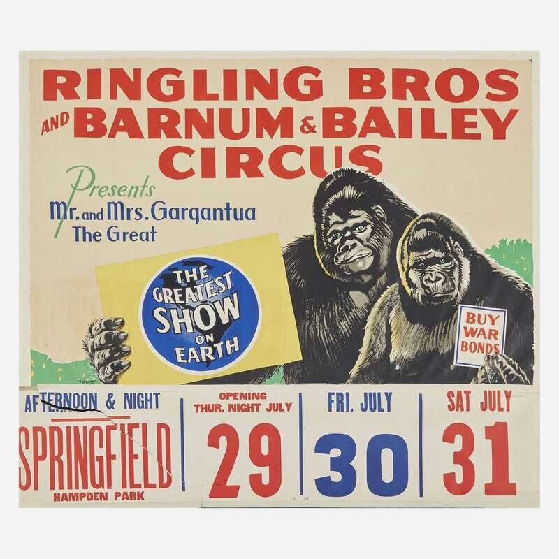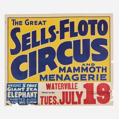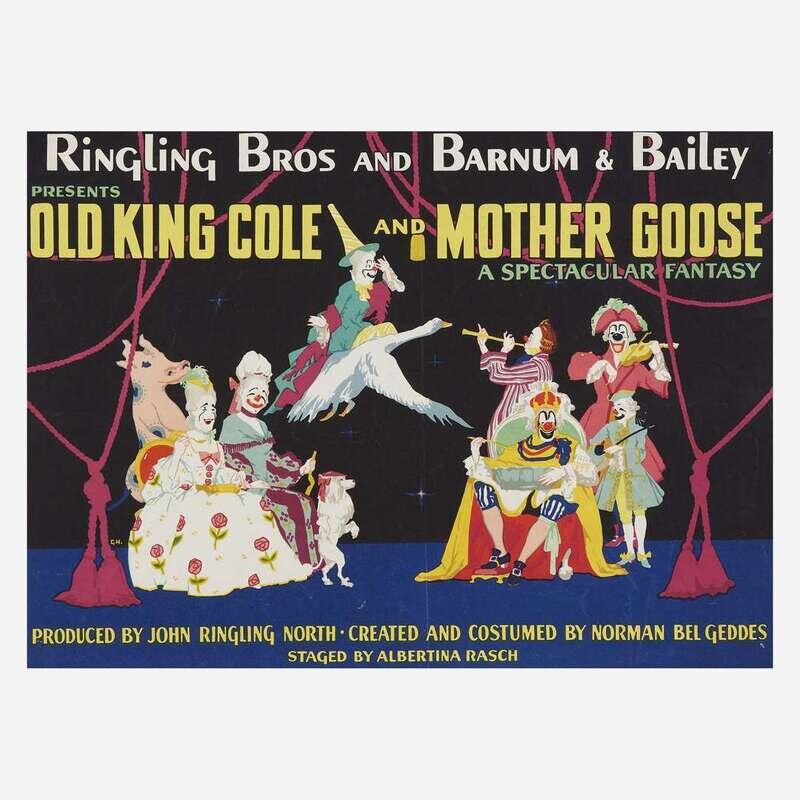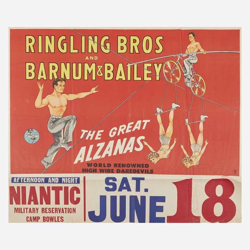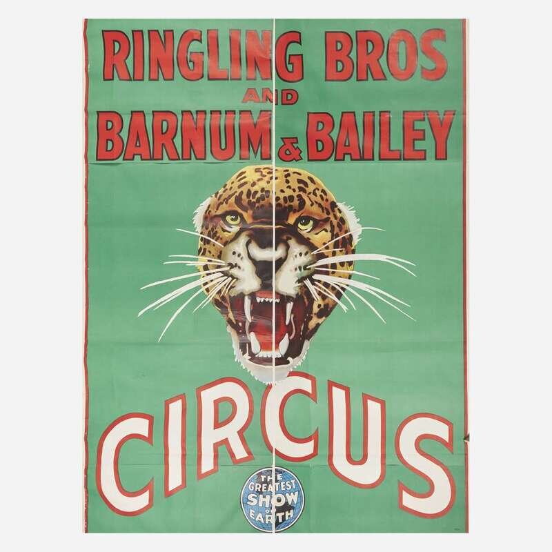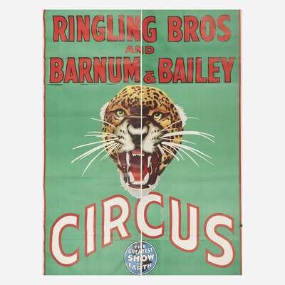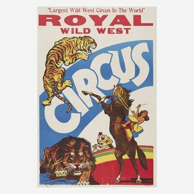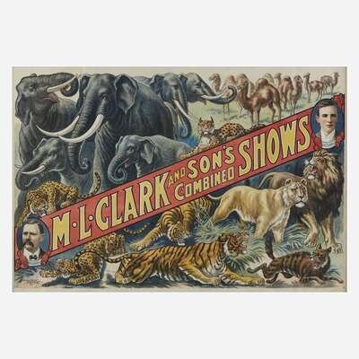 Comprising mostly unframed (some rolled) lithograph posters: Ringling Bros. and Barnum & Bailey "Tiger", which is two rolled sheets that can be presented together, by Amalmagated Lithographers of America, Cinncinati; The Great Sells-Floto Circus; two small Ringling Bros. and Barnum & Bailey posters: "Old King Cole and Mother Goose" and "Clown"; Royal Wild West Circus; Ringling Bros. Barnum & Bailey "The Great Alzanas"; Ringling Bros. and Barnum & Bailey "Mr. and Mrs. Gargantua the Great", by Bill Bailey; Ringling Bros. and Barnum and Bailey "Lake Front" poster with tiger and moon, rolled; and "M.L. Clark & Son's Combined Shows", by The Donaldson Litho. Company, Newport, KY, framed.