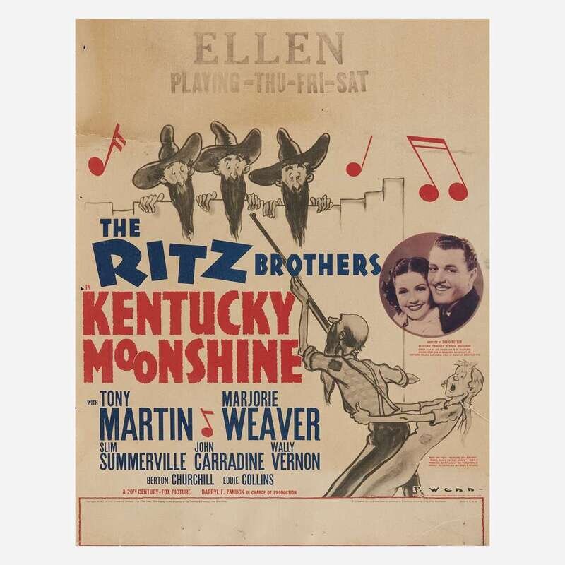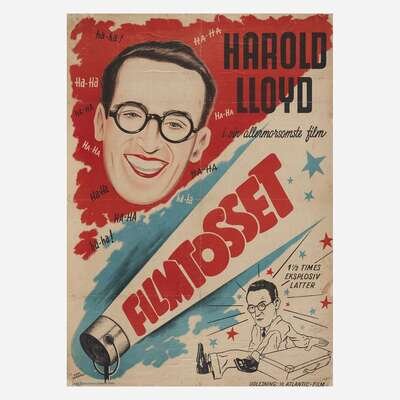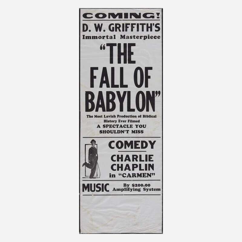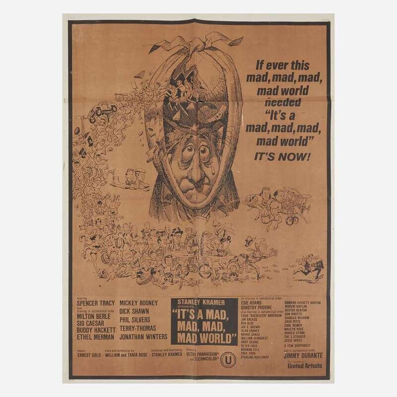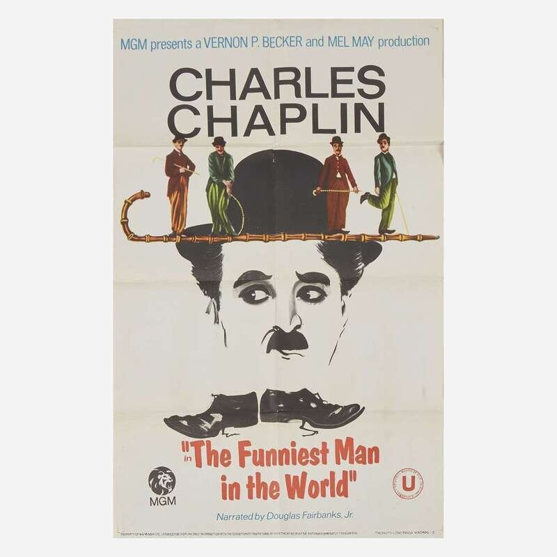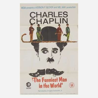 Comprising three posters for Charlie Chaplin films: "The Funniest Man in the World", "The Fall of Babylon", and "The Great Dictator"; and other miscellaneous posters including "It's a Mad, Mad, Mad, Mad World", "The Ritz Brothers Kentucky Moonshine", and "Filmtosset", backed on canvas; some fold-out, all unframed. .