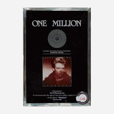 The first, "Presented to A&M Records, Inc. to commemorate the sale of over one million copies in Canada of the Album 'Reckless' December 1985", plastic resin plaque.; the second, "Presented to Dick Clark to commemorate his participation in the #1 single 'Summer's Comin'', matted and framed assemblage.