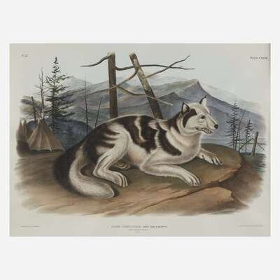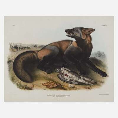 Hand-colored lithograph. Plate CXXXII from Audubon's "The Viviparous Quadrupeds of North America" (1845-48), together with American Cross Fox, Hand-colored lithograph. Plate VI from Audubon's "The Viviparous Quadrupeds of North America" (1845-48). Unexamined out of frame.