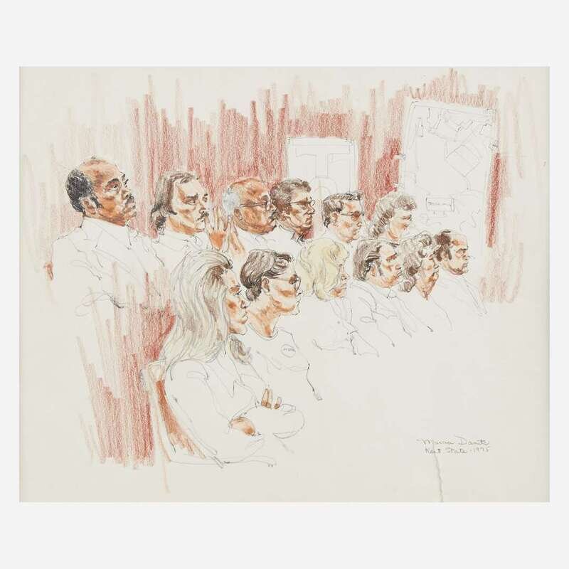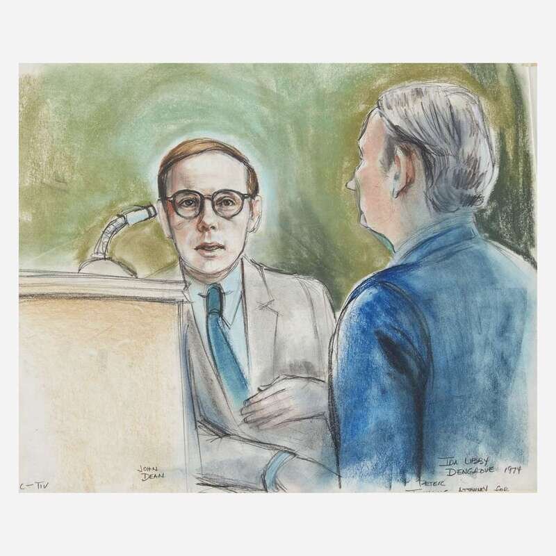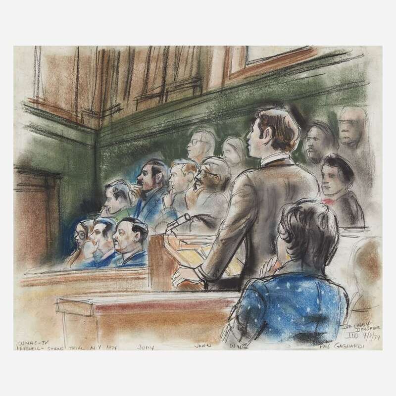 With two works by Ida Libby Dengrove: John Wing before the jury at the Mitchell-Stans Trial, NY 1974, signed, and dated, "4/8/74", l.r., pastel on paper, matted, and John Dean with Attorney for John Mitchell, Peter Fleming at the Mitchell-Stans Trial, signed, and dated, "1974", l.r.; and a work by Marcia Danits: the jury at the Kent State Trial, signed, and dated, "1975", l.r., pencil on paper, matted.