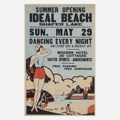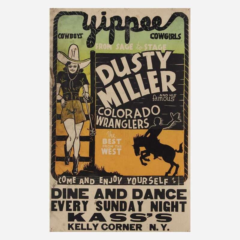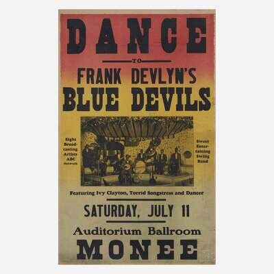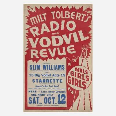 Comprising "Dance to Frank Devlyn's Blue Devils", Kankakee, Illinois; "Baseball/ Satchel Paige", Mayville, North Dakota, published by Tribune Press, Earl Park, Indiana; "Dusty Miller and his famous Coloroda Wranglers", Kelly Corner, New York; "Summer Opening/ Ideal Beach Shafer Lake", published by Bower Show Print, Fowler, Indiana; and "Milt Tolbert's Radio and Vodvil Revue: Featuring Slim Williams".