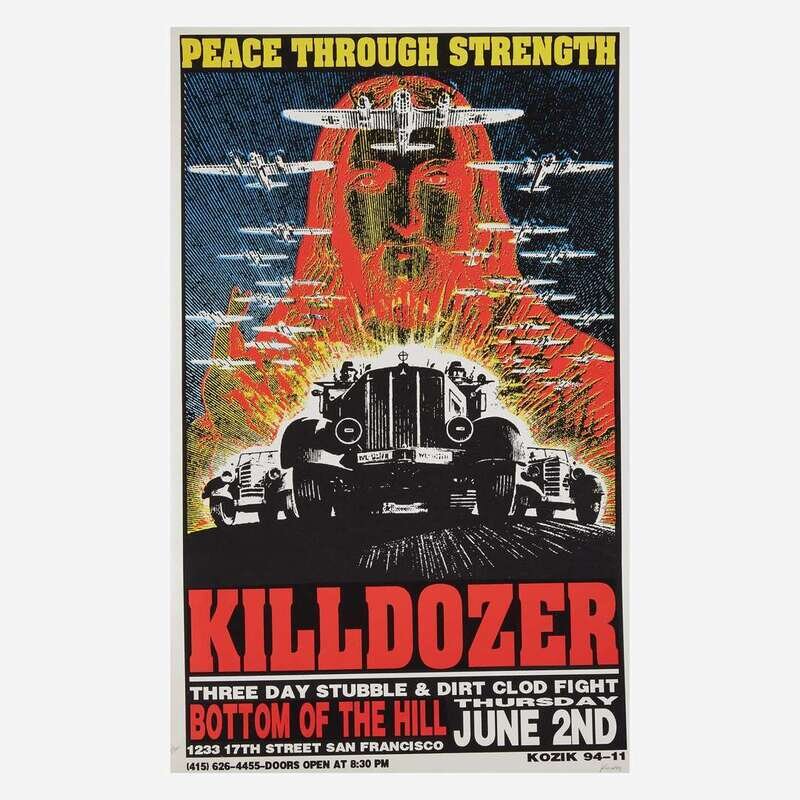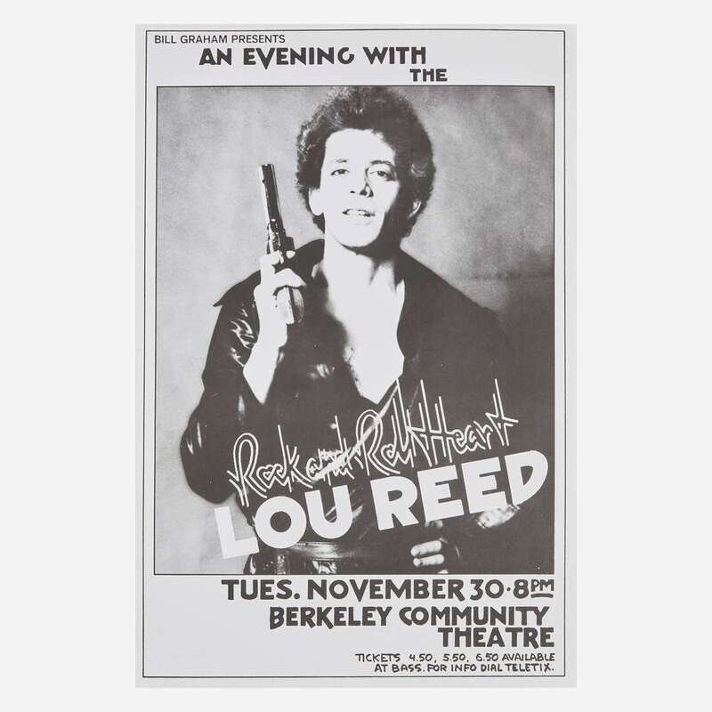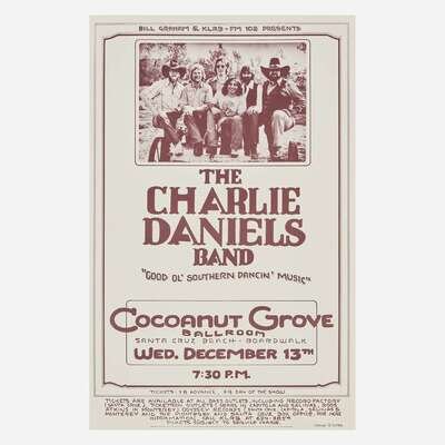 Comprising "The Guitar & Voice of Led Zepellin/ Page Plant" by Mercury; "Bill Graham Presents An Evening with the Rock and Roll Heart Lou Reed"; "Bill Graham & KLRB FM102 Presents The Charlie Daniels Band", by R. Tuten; "Four Ink Spots", by Quick Poster Service, Goshen Ltd.; a Bob Dylan poster, by Danny Clifford, published by Big O Publishing Ltd.; and "Killdozer", signed, "Koukgy(?)", l.r.