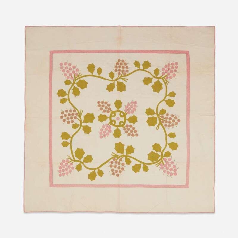 Worked with printed cotton pieces and heightened with embroidery, and feather and flowerhead quilting.