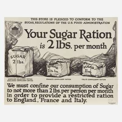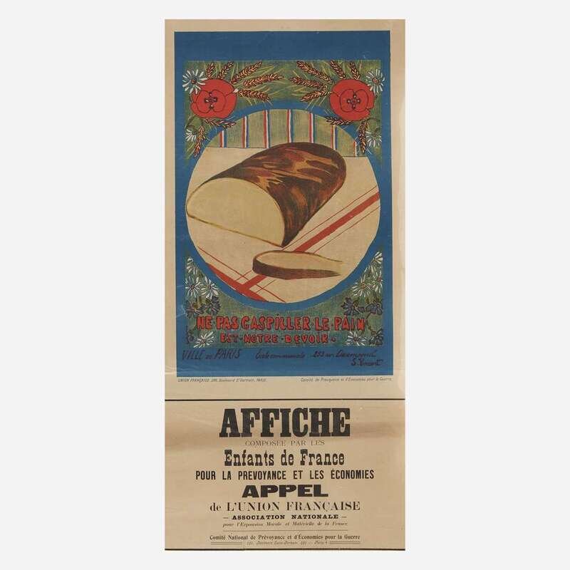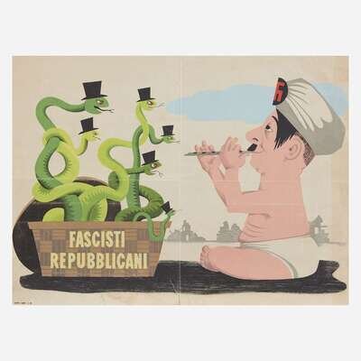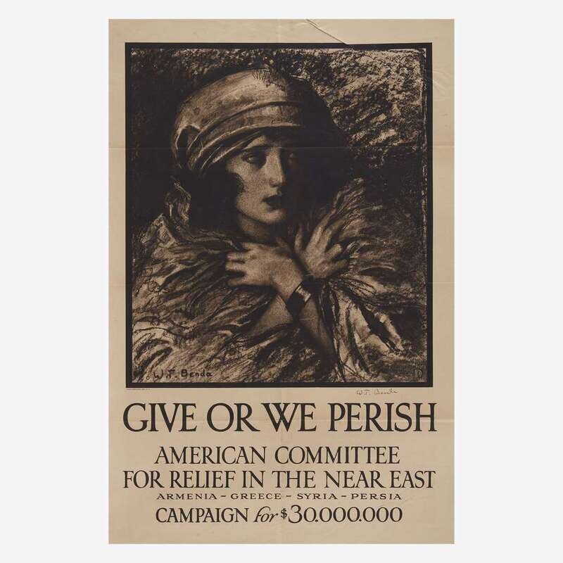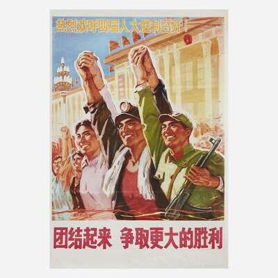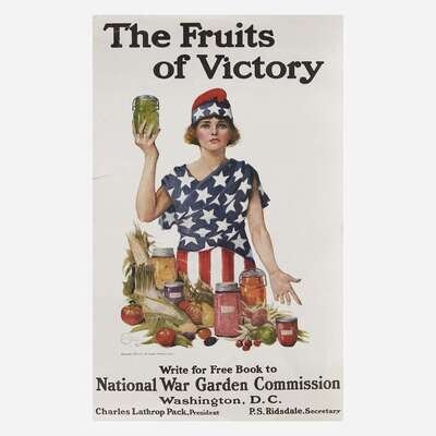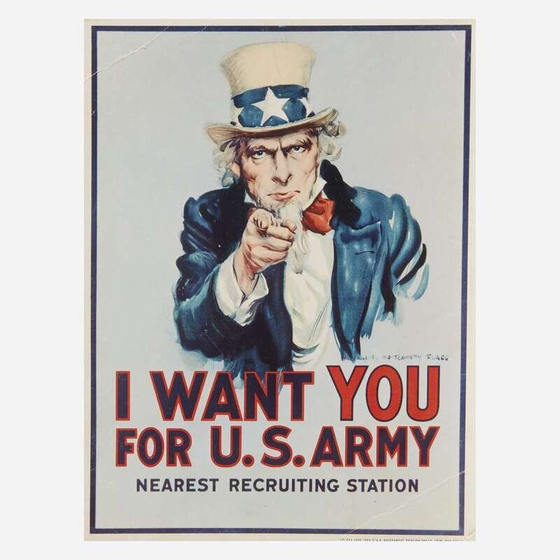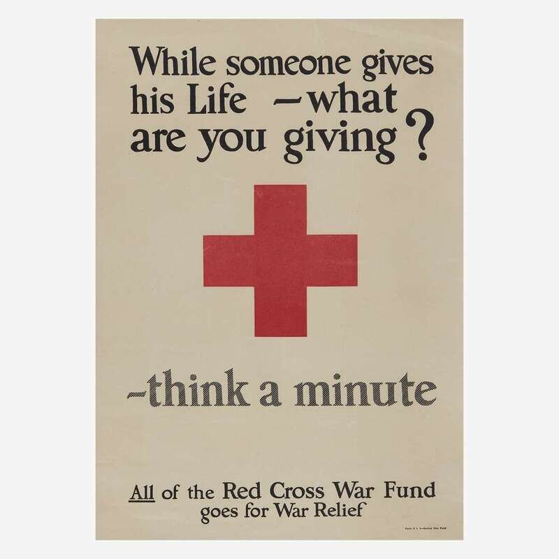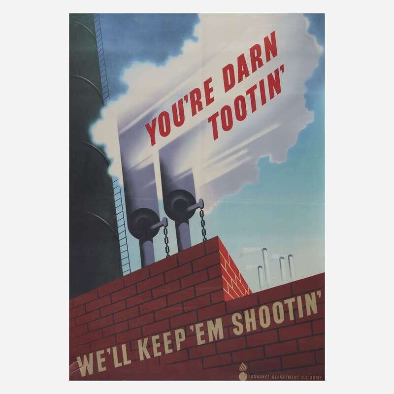 Comprising examples from WWI, WWII, and later, including the following: "You're Darn tootin'" by U.S. Government Printing Office, 1942; a small paperboard "I Want You for U.S. Army" recruiting poster, by U.S. Government Printing Office, 1976; "Red Cross War Fund", art by Cleonebel Jacobs, published by F.M. Lupton, copyright 1918; "Give or We Perish/ American Committee for Relief in the Near East", art by W.T. Brenda and signed, l.r., published by Alco-Gravure, Inc., New York; "The Fruits of Victory"; two rationing posters, one by The Carey Printing Company, New York; a French "Affiche" poster; a Chinese Communist propaganda poster circa 1960; and a "Fascisti Republicani" poster, circa 1940s; all unframed.