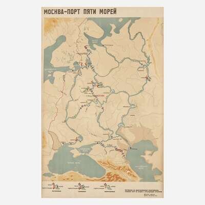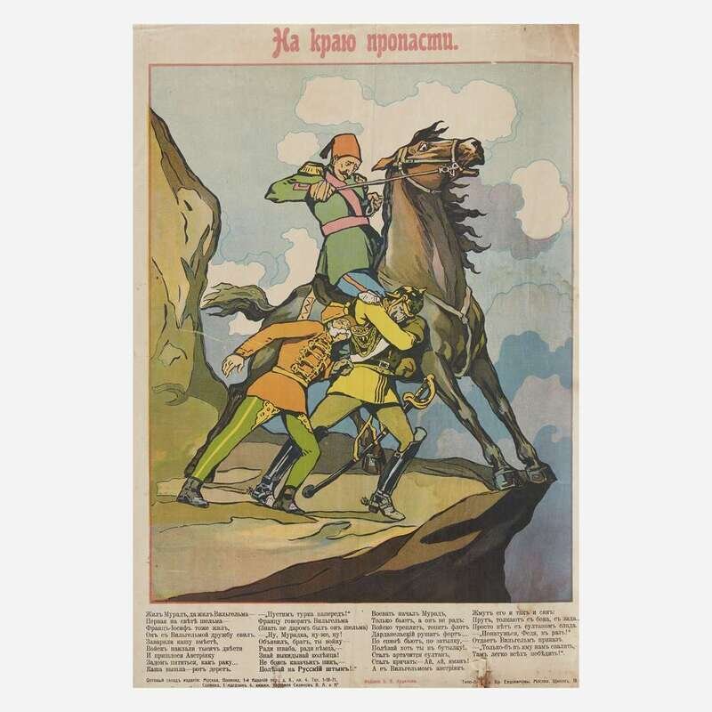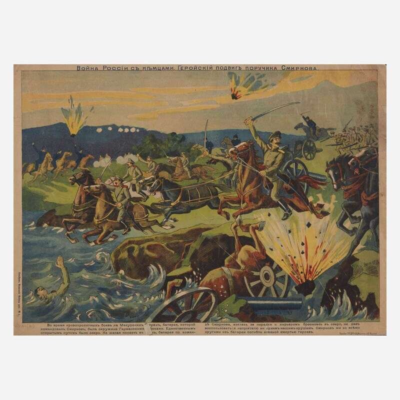 With Cyrillic script, the two war scenes printed in Moscow; the map backed on canvas; all items in this lot unframed.