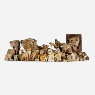 Comprising wild animals including lions, tigers, monkeys, elephants, a jaguar, a camel, a giraffe, a rhino, and a fox; including some hand puppets and a head mounted on wood plaque.
