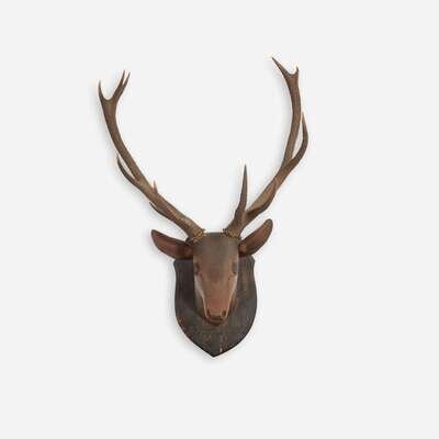 Two carved and painted wood deer heads mounted with antlers 19th/20th century