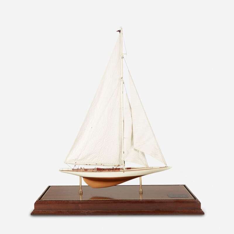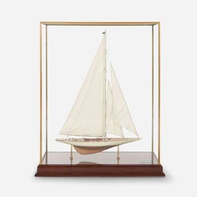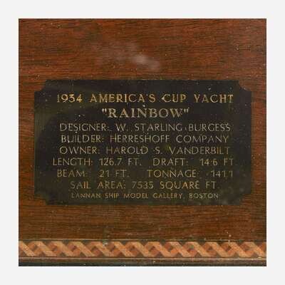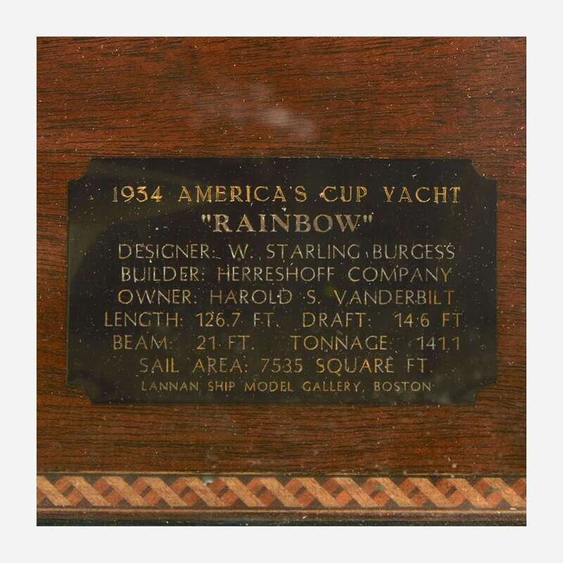 With custom wood, metal, and glass display case, with plaque inscribed "1934 America's Cup Yacht 'Rainbow' Designer: W. Starling Burgess/ Builder: Herreshoff Company/ Owner: Harold S. Vanderbilt/ Length: 126.7 Ft./ Draft: 14.6 Ft./ Beam: 21 Ft./ Tonnage: 141.1/ Sail Area: 7535 Square Ft./ Lannan Ship Model Gallery, Boston".