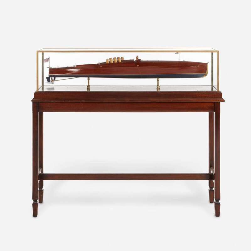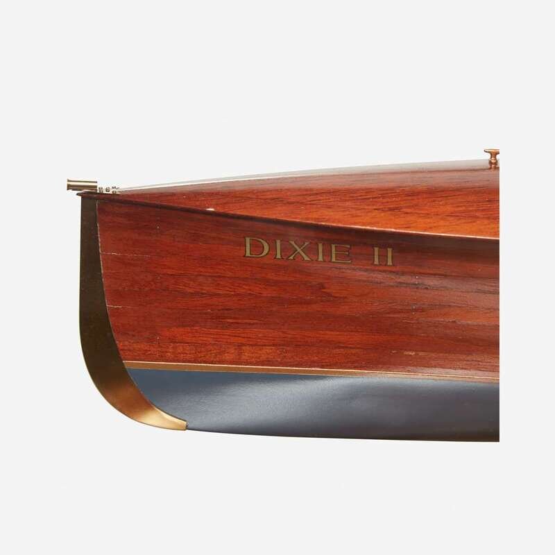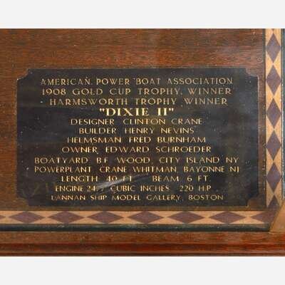 Housed in a glass, wood, and metal display case, with metal plaque inscribed "American Power Boat Association/ 1908 Gold Cup Tophy Winner/ Harmsworth Trophy Winner/ 'Dixie II'/ Designer: Clinton Crane/ Builder: Henry Nevins/ Helmsman: Fred Burnham/ Owner: Edward Schroeder/ Boatyard B.F. Wood, City Island NY/ Powerplant Crane Whitman, Bayonne NJ/ Length 40 Ft./ Beam 6 Ft./ Engine 2477 Cubic Inches 220 H.P./ Lannan Ship Model Gallery, Boston", together with custom wood pedestal base.