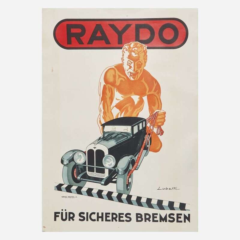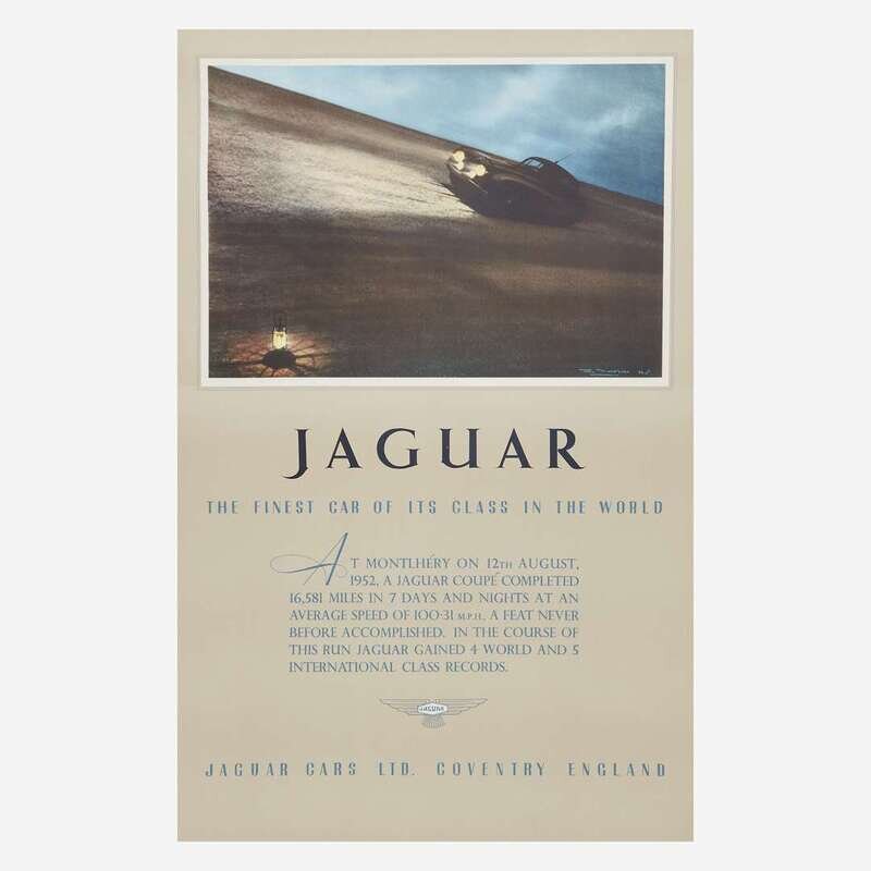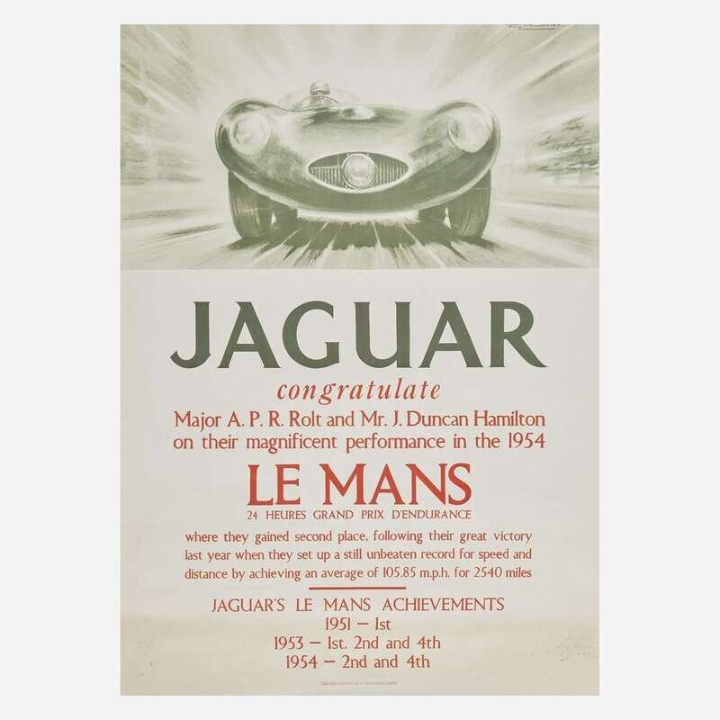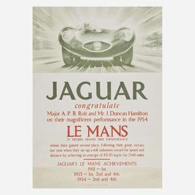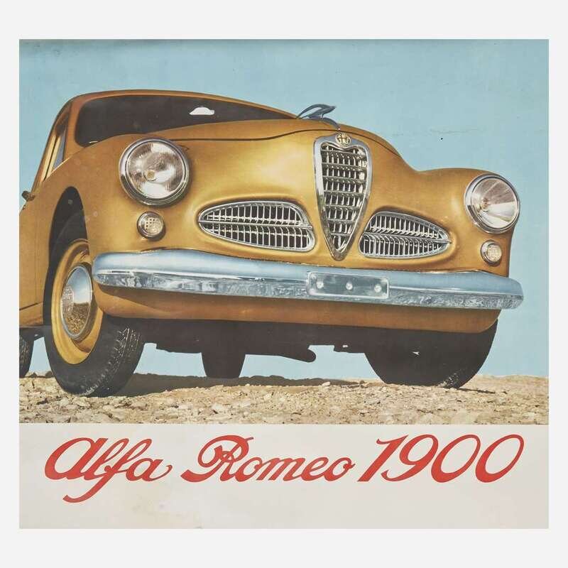 Comprising "Alfa Romeo 1900", by A. Pizzi S. A., Milano, backed on canvas; "Jaguar congratulate Major A. P. R. Rolt and Mr. J. Duncan Hamilton on their magnificent performance in the 1954 Le Mans", Adams Bros & Shardlow Ltd., Leicester; "Jaguar/ The Finest Car of its Class in the World", A. B. & S. Ltd., Leicester, backed on canvas; and "Raydo" German brakes, circa 1935, by Domenic Lubatti, printed by Gros. Monti & Co., Torino, backed on linen; all posters unframed.