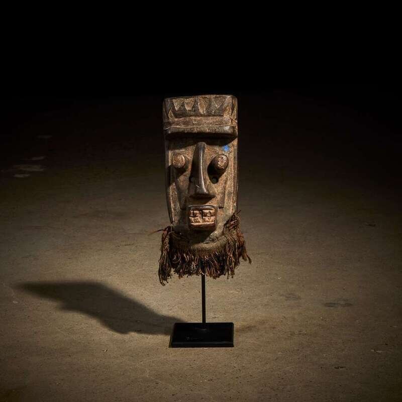Carved wood and fabric, the rectangular face with tubular eyes, squared mouth and ridged nose below an overhanging forehead, with a domed section on the reverse, well developed patina, raised on a bespoke mount.