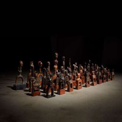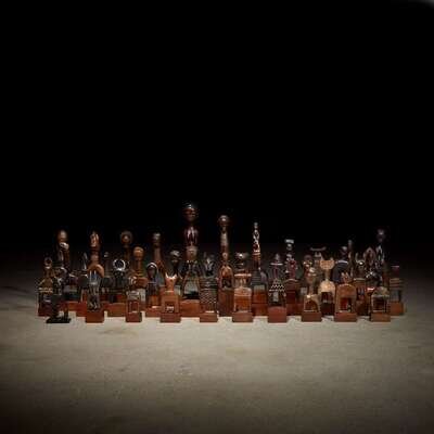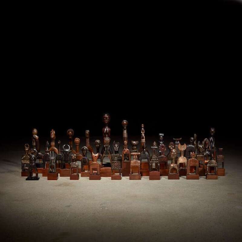 Comprising of a selection of carved wood Guro, Jimini, Senufo, and Baule heddle pulleys, each with an elaborate finial and incised pattern colored with kaolin, each with painted inventory number, raised on bespoke wooden mounts. (42).