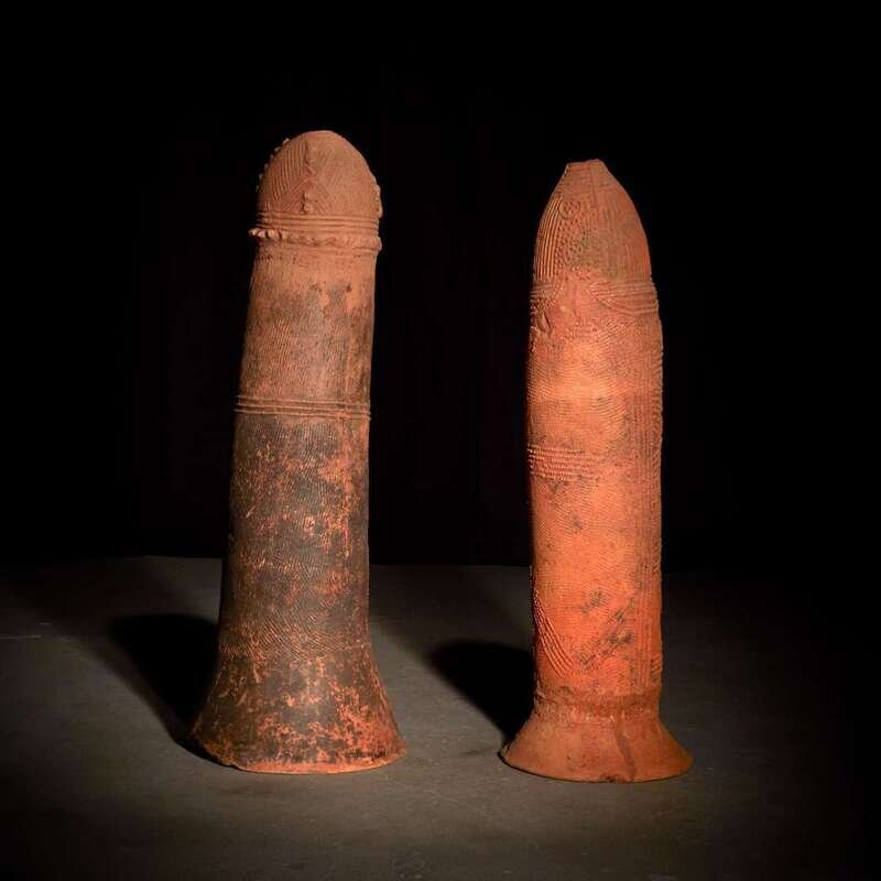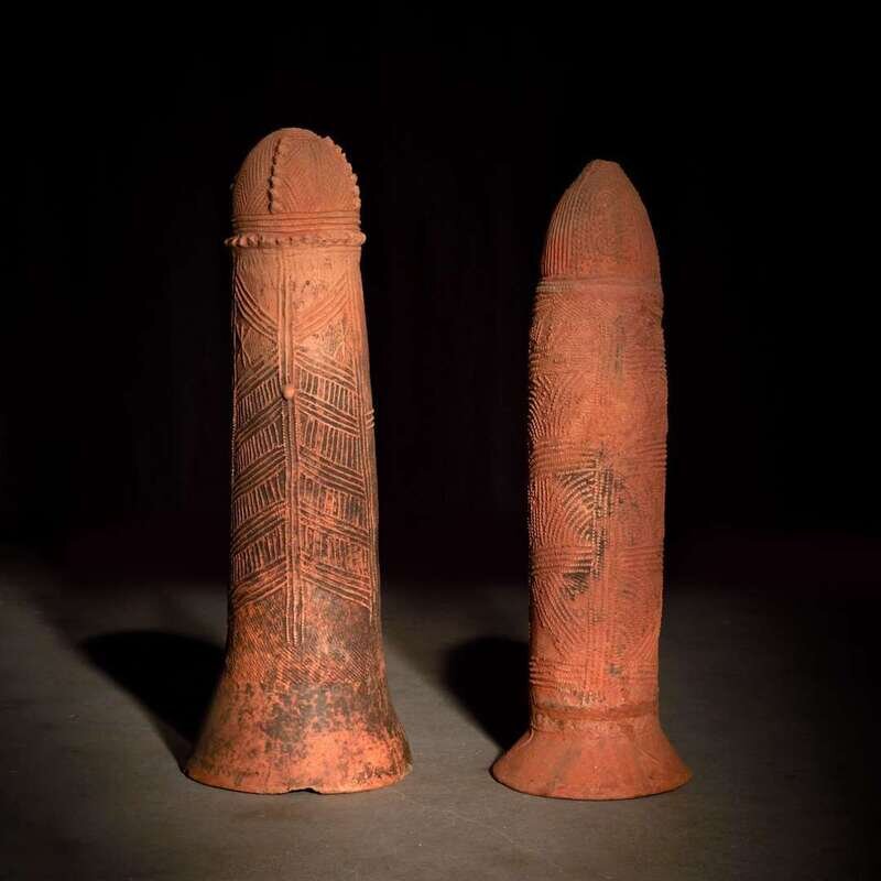 Fired terracotta, a pair of phallic form urns with elaborate hand incised designs. (2).