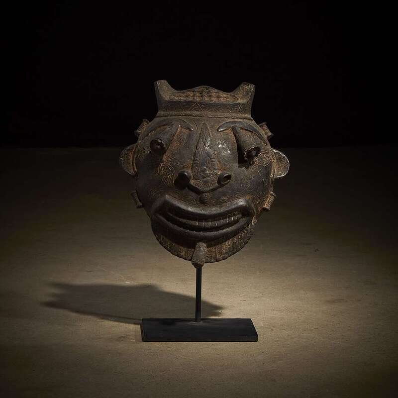 Cast bronze, with a surrealist quality displaying a combination of human and zoomorphic traits, drooping cone-like eyes, broad flat nose and gaping smile, shown bearded, the face with etched decoration of insects, raised on a bespoke mount.