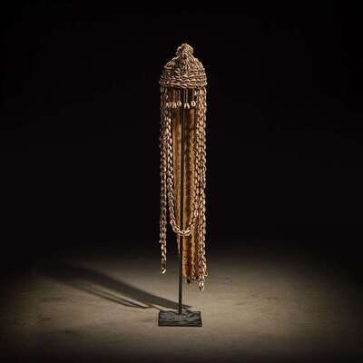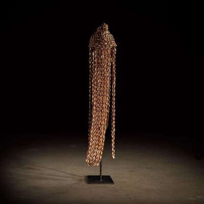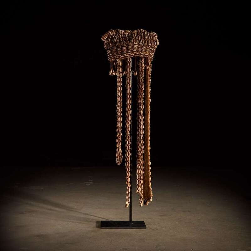 Leather, cowrie shell and vegetal binding, with a cone shaped finial and long strands of shells falling below, raised on a bespoke mount.