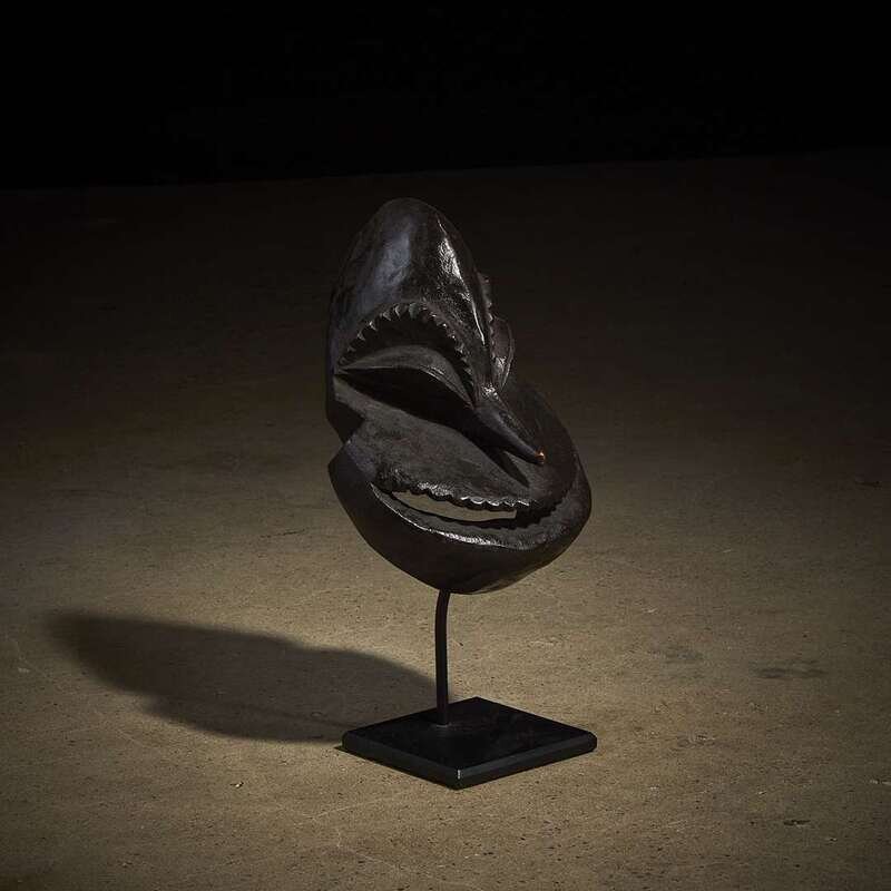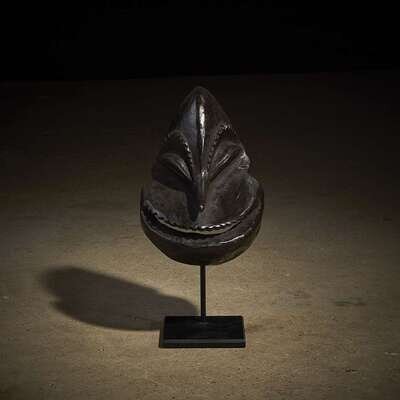Carved wood, the face in the shape of a monkey's head, with a broad grinning smile revealing jagged teeth, a pointed nose and hatched eyebrows, dark patination, raised on a bespoke mount.