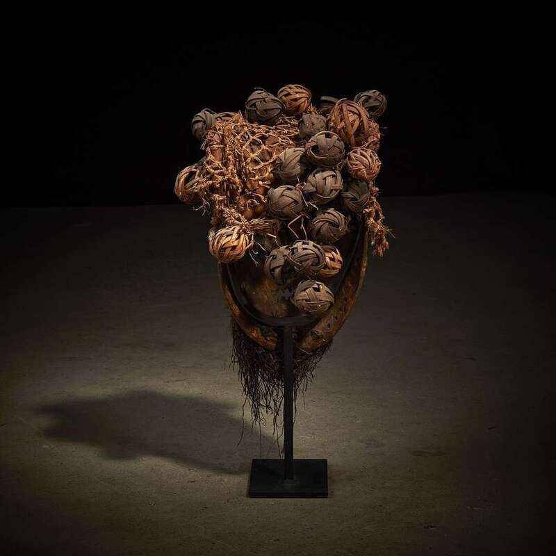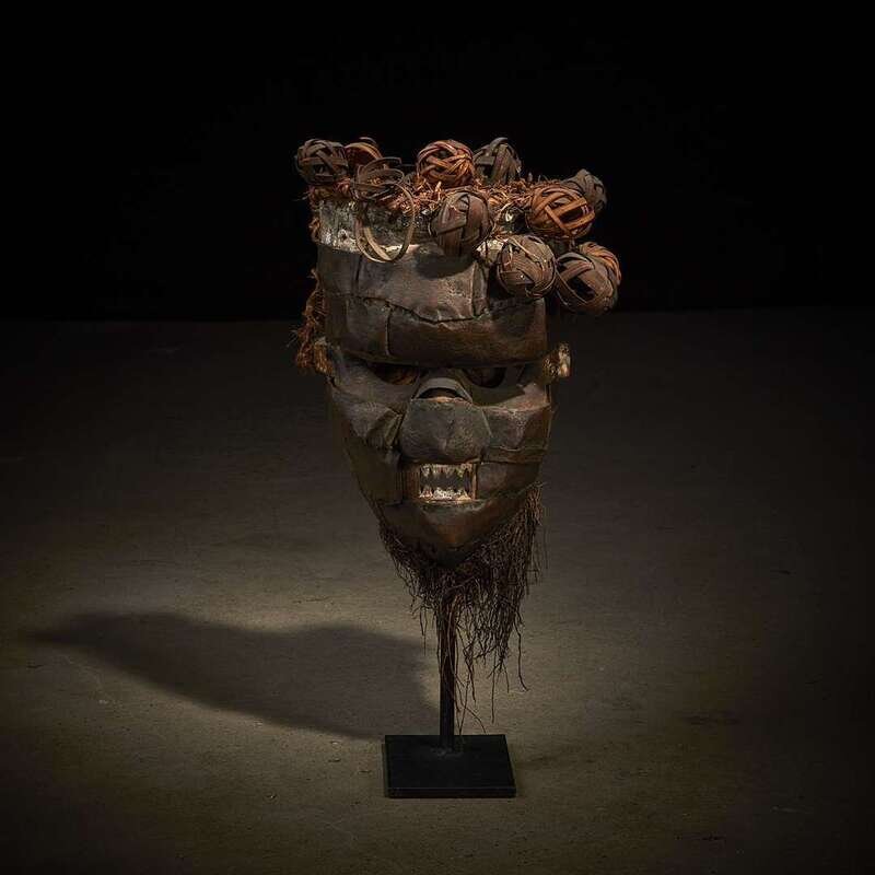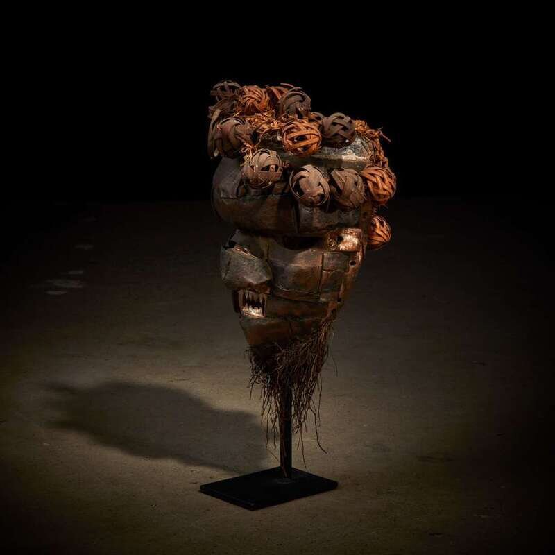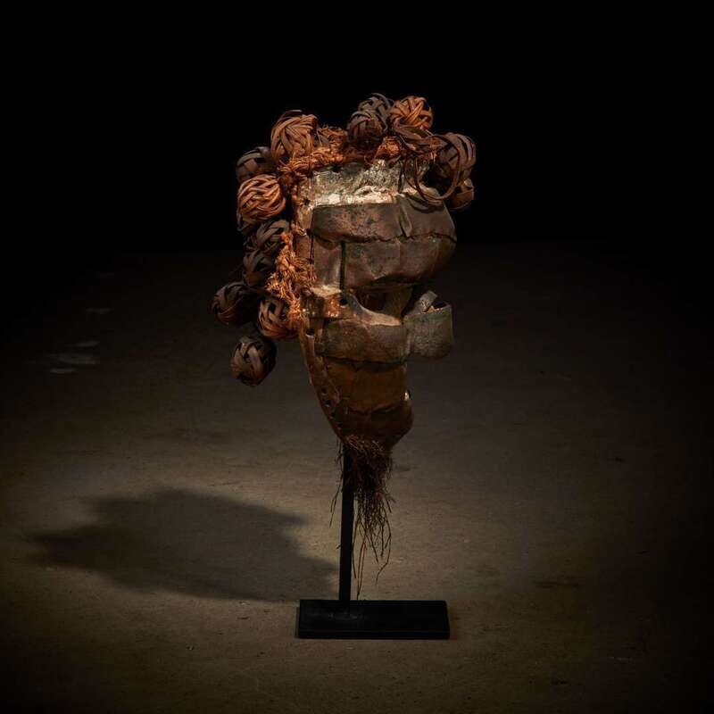 Carved wood, copper and raffia, covered with copper plating, the oval face with domed forehead, prominent nose and rectangular mouth shown baring teeth, a thin raffia beard hanging from the chin and woven ball coiffure, the mouth stained with kaolin, raised on a bespoke mount.