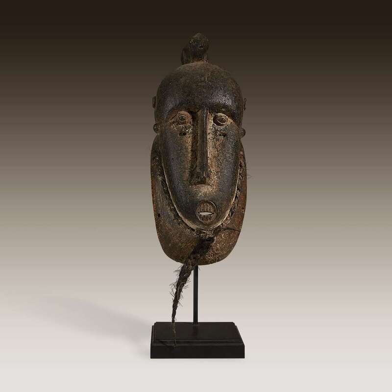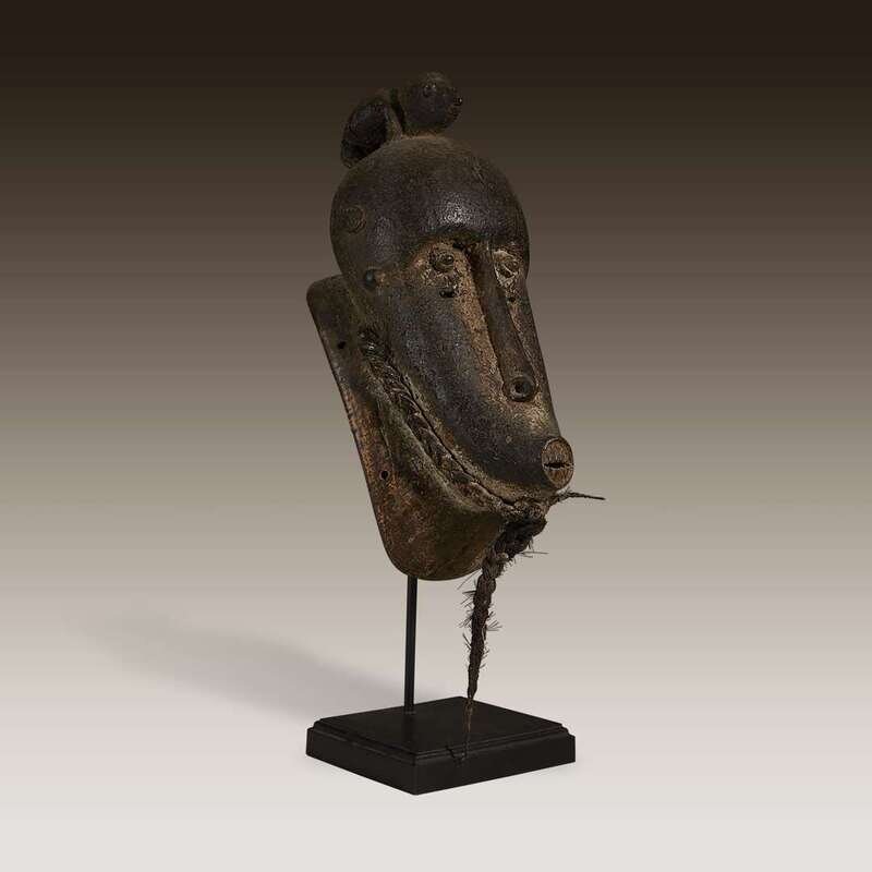 Carved wood, the elongated head with dome forehead, deeply set eyes parted by a slender nose, the mouth pushed forward into a cone with the teeth exposed, deep patination, raised on a bespoke mount.